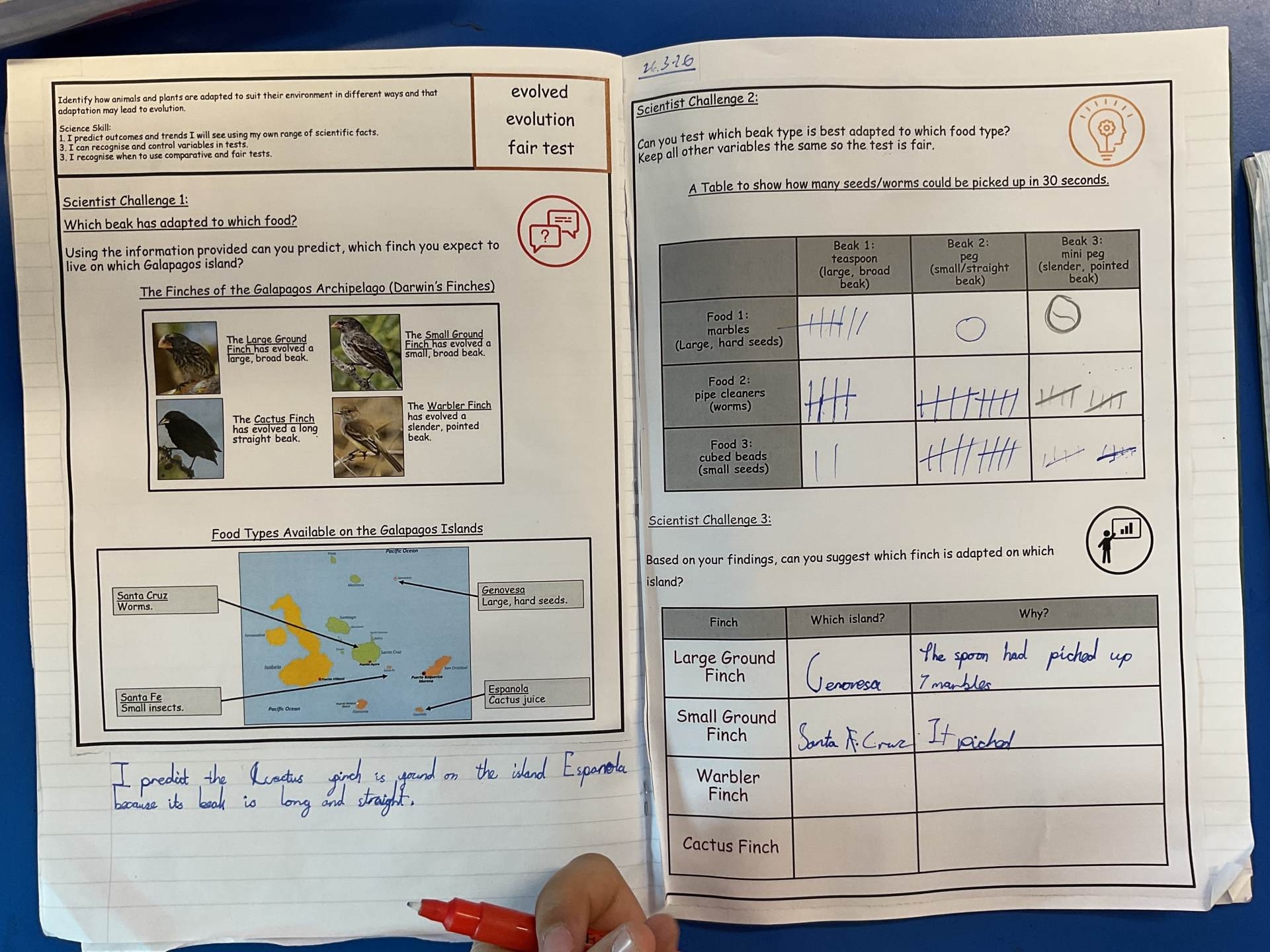 We represented beaks using pegs and spoons, and attempted to pick up different types of ‘food’, including beads, marbles and pipe cleaners. By comparing which tool worked best for each food type, we identified which finch would be suited to which diet - and even predicted the island it might have come from.