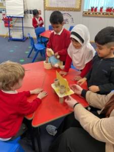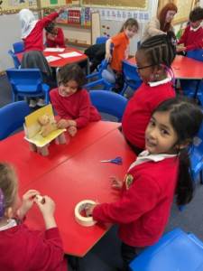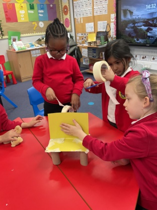 In DT, we made a new chair for Baby Bear, whose chair was broken by Goldilocks! The children investigated what chairs are, what types of chairs there are and what makes chairs stable. We then built our own chairs, with the children discovering how to join the legs to the seat and the seat to the back. Our chairs were ‘just right!’ for Baby Bear.
