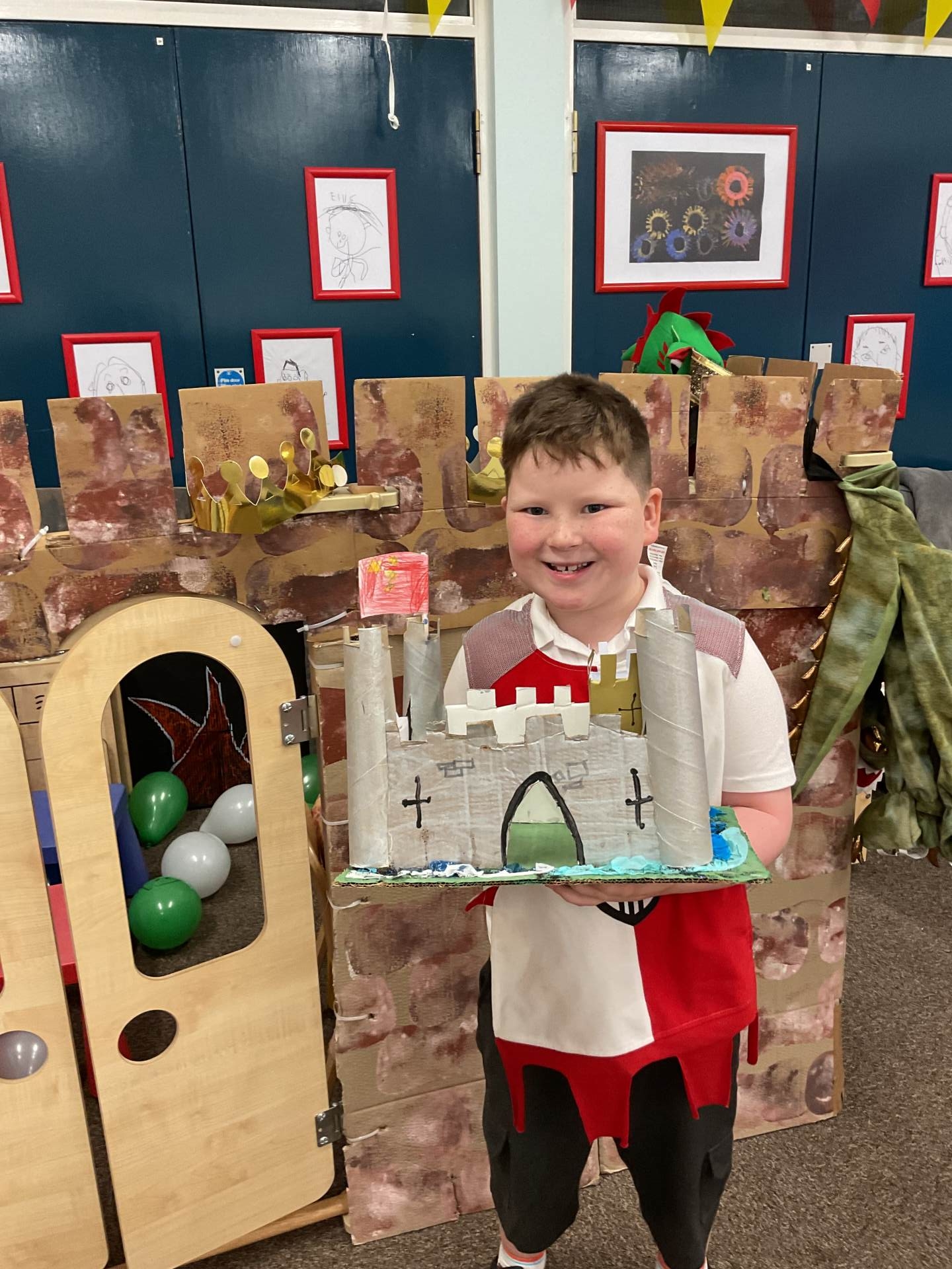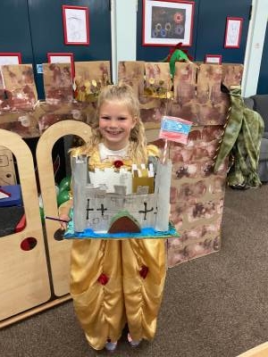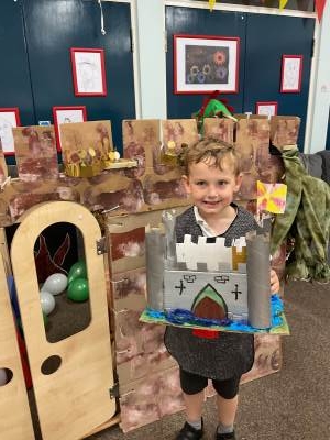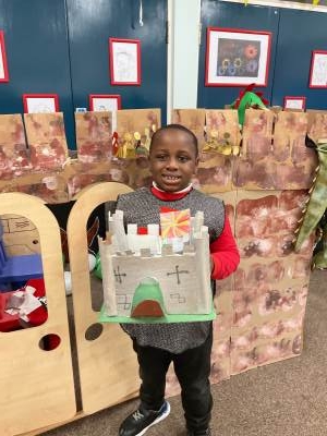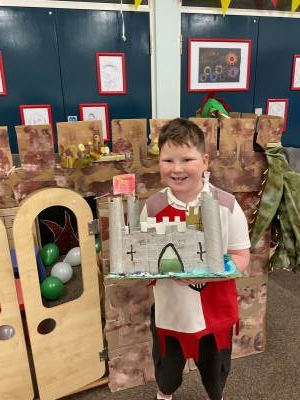 We have had a D.T. Project for this half term – we made fantastic 3-D models of castles – inspired by our trip to Newcastle Keep – and also with a little advice from children in Year 2! We built our castles one step at a time! It was tricky creating battlements and cutting the cardboard! We added towers on each corner and we know the walls were rectangles and the towers were cylinders! Do you like our amazing flags? We used model knights on horseback to create invasions! Look at our photos holding our 3-D castles in front of our own Class Castle – also made by us!